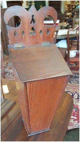 Based on family history, this candle box is attributed to Winchester, Virginia. As would be expected, it is made of Southern Yellow Pine. T-nails have been used for joinery, suggesting a ca. 1800 time period. Notice the heart cut-out in the scrolled crest. This is a rare survivor and the first one we have seen.